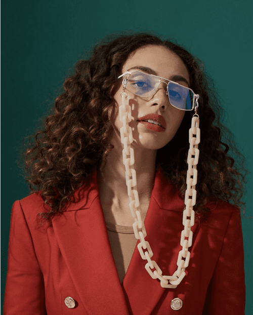 Crystal finish super size chain in orange amber. Fitted with lobster clasp and silicon loops for dual use as eyewear chain or regular neck chain.