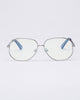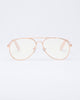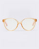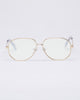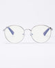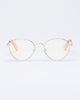 New undersized round metal style They Got Farther goes further and adds 12 IQ points per wear! JK. In polished light gold metal with thick rim profile and crystal lemon tips, each pair is fitted with our signature blue light lens technology which cuts up to 30% of blue light emitted from digital devices, available across all magnifications.